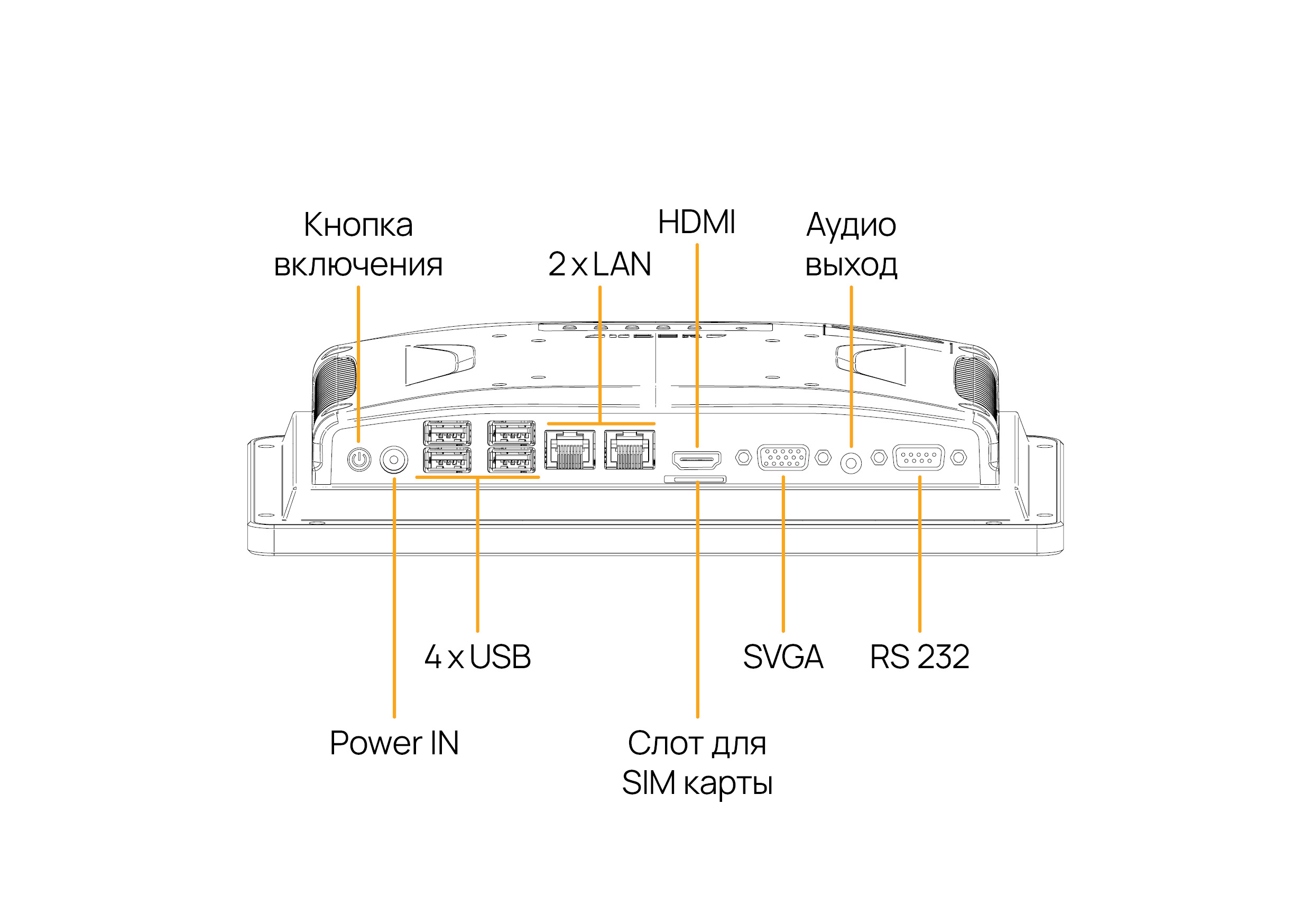 Для подключения к сети предусмотрены два порта Ethernet. Дополнительно POS-моноблок может быть оснащён встроенным модулем WiFi или GSM. Опционально можно подключить второй монитор для покупателя или MSR-ридер карт.