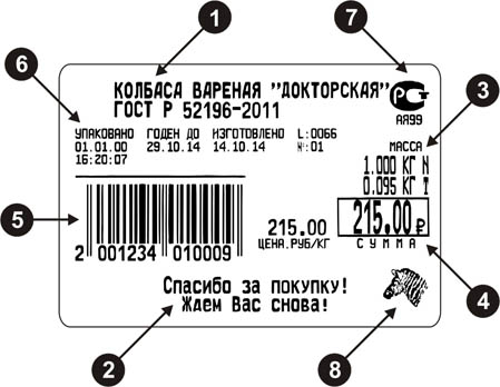 - Сведения о датах изготовления и упаковывания, сроке годности товара, номере этикетки и номере весов;